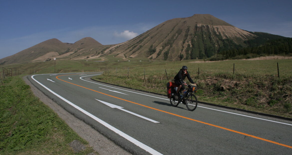 Der Makinoto Pass (1330m) ist nach gut 500 Höhenmetern geschafft. Wir stehen sozusagen auf dem Kraterrand des Aso-san Vulkangebiets. Insgesamt hat der Krater einen Umfang von 128 km, geformt von einer monströsen Explosion vor 90000 Jahren. Im Krater unter uns liegt die Stadt Aso. Auch Straßen, Bahnlinien und andere Dörfer befinden sich auf dem mächtigen Teller. Die Vulkane auf ihm sind noch aktiv – es ist laut unserem Reiseführer der größte noch aktive Kessel (Caldera) der Welt. 1993 war der letzte nennenswerte Ausbruch. Wir düsen hinunter und steuern direkt auf das Vulkanmassiv zu. Ich komme mir vor wie ein Cowboy in der Prärie: grüne Wiesen, kleine Schluchten, in denen die Straße versinkt, Kühe, Pferde und Angebote zum Westernreiten links und rechts. Schilder wie „Big animal ahead“ mit einer Kuh darauf dienen hier schon mal als Touristenattraktion. Naja, für Ameisen sind Kühe ja auch riesig! Steil geht es hinauf und wäre da nicht der Gestank all der Ameisenausdünstungen und ihr Furzen in meinen Ohren – man könnte sich glatt daran gewöhnen, so in der Truppe unterwegs zu sein. Das Tempo ist insgesamt langsam, da es viel zu sehen gibt und bergauf alle ein wenig zu schnaufen haben. Nach weiteren 500 Höhenmetern erreichen wir den Abzweig zu unserem Zielgebiet zwischen Akamizu und Tateno. Wir setzen uns auf die leuchtend grüne Wiese mit Blick auf einen perfekt geformten kleinen, bewachsenen Vulkan und feiern „Kaffeene“. Der Vulkan sieht aus wie aus dem Bilderbuch. Auch der große Bruder, der hinter uns steht, ist ein Blickfang, doch der kleine grüne mit dem wohlklingenden Namen „Kome-zuka“ hat es uns angetan. Die Abfahrt führt an einem groß angelegten Rastpark vorbei und wir zögern kurz, ob wir hier oben zelten sollen. Die anderen Ameisen verschwinden sicher bald in ihre gebuchten Löcher und wir wären allein. Doch wir haben keine Genussmittel dabei und auch kein öffentliches Bad in der Umgebung. So entschließen wir uns, bis zu einem Onsen abzufahren. Der in unserem japanischen Straßenatlas verzeichnete entpuppt sich als riesige Disneylandanlage, bestehend aus einer Milchfarm, Schmockesgeschäften, mehreren Bädern, Restaurants und unzähligen Bungalows, die aussehen wie Taucherglocken. Tausende wimmeln herum. Hier ist nicht an ruhiges Zelten zu denken. Mittlerweile hat sich ein Stau bergab gebildet und wir bereuen es, wegen ein paar Einkäufen auf unseren tollen Zeltplatz mit Vulkanblick verzichtet zu haben. Jetzt, wo wir nunmal unten sind, müssen wir das Beste daraus machen. Wir kaufen ein und begeben uns dann ins warme Wasser des großen öffentlichen Onsen in der Nähe. Bis zehn können wir uns noch drinnen aufhalten, dann geht’s hinaus. Ein vorher erkundetes leer stehendes Feld wollten wir bezelten, doch als wir nochmal eine Runde über den großen Parkplatz drehen, beschließen wir, uns hier auf ein Stück Rasen in einer dunklen Ecke zu stellen. Ein Wohnmobil hat sich auch schon schlafbereit aufgestellt und die verhängten Scheiben einiger geparkter Autos deuten darauf hin, dass sich hier Leute zum Schlafen hineingefaltet haben. Neben uns ist noch ein Pärchen mit dem Kochen des Abendessens beschäftigt. Das hat fast Campingplatzatmosphäre. Auch wir kochen noch ein Mapodofu und sitzen dann ein Weilchen in der ach so lauen Frühlingsnacht. Wer hätte das gedacht!