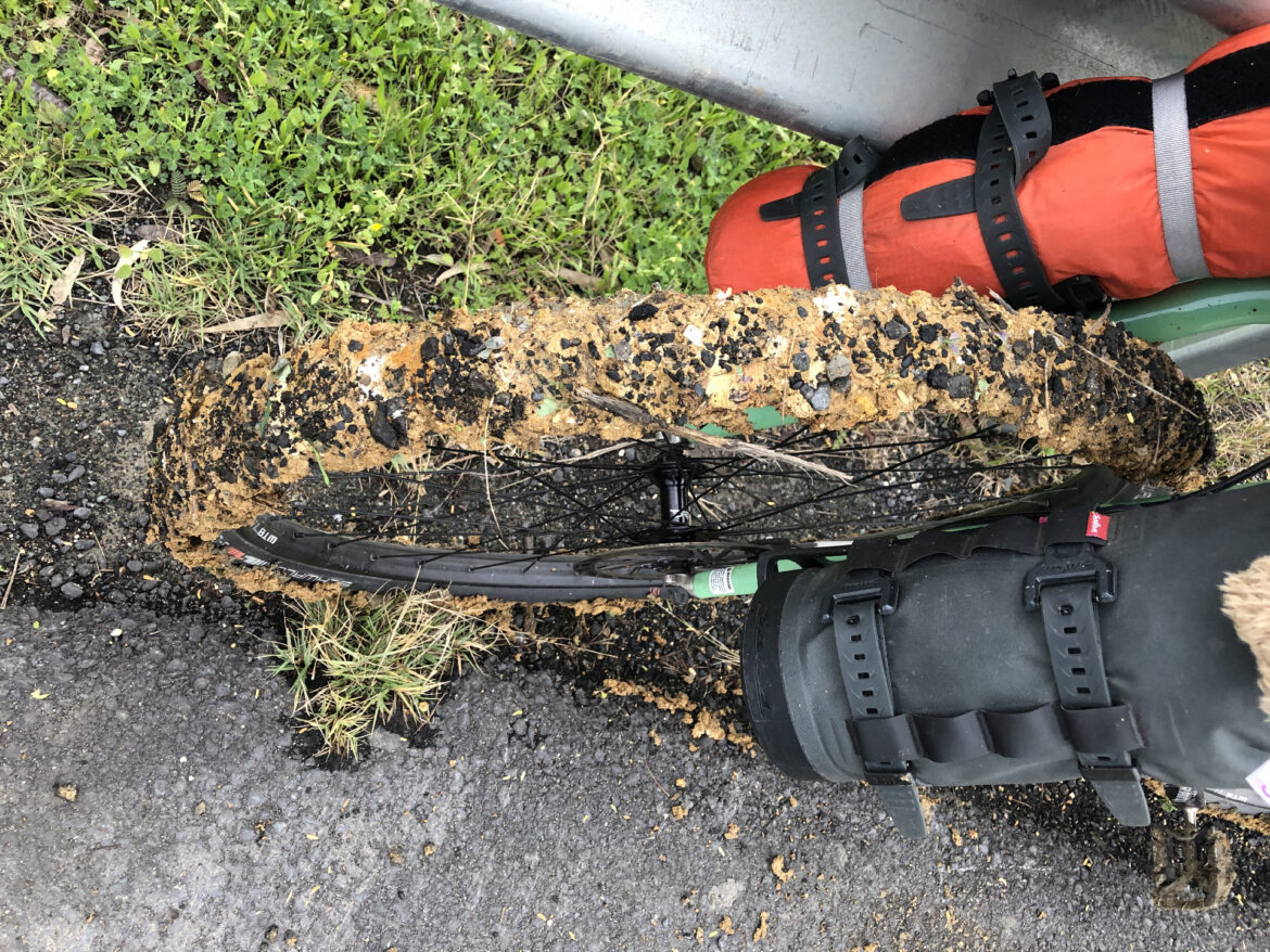 Aber eben leider nur bis kurz davor. Gedanklich schon beim Abendessen, standen wir plötzlich im Dreck! Unvermittelt mündete der Radweg unter der Autobahnbrücke in ein braunes Etwas. Wir wuchteten unsere – nach der Pflege in Lissabon bis dahin noch super sauberen – Räder durch den Matsch. Und zwar richtig fies klebrigen Supermatsch, der in der Folge frohlockend Kieselsteine speicherte.
