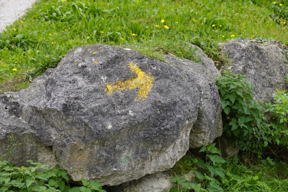 Schnell gewöhnten wir uns an die Beschilderung, einen kleinen gelben Pfeil oder eine Muschel, die uns den Weg wies. Wenn es zu geröllig oder gar zu steil wurde, konnten wir ja wie gesagt meist auf die Straße ausweichen und weiterbrausen statt zu schieben.