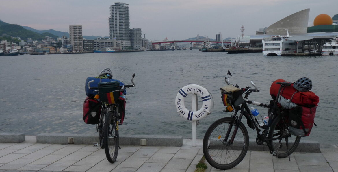 Die Dichte der vorbeifahrenden Autos erhöht sich, es ist hell – ein Blick auf die Uhr bestätigt den Verdacht: Es ist 7 Uhr. Zeit, unseren Parkplatz zu räumen. Nicht, dass der Hund, der nachts um 3 an unserem Gepäck geschnüffelt hat, seine Freunde holt. Schnell sind unsere Habseligkeiten verpackt, unter den gestrengen Augen der ersten Frühraucher auf den Balkonen des gegenüberliegenden Hotels. Wir sind guten Mutes, schließlich ist es warm, der Himmel blau und es liegt eine Abfahrt ins Tal vor uns. Zuerst aber muss gefrühstückt werden, was mittels Getränke- (und damit Kaffeeautomat) und kleinem Lebensmittelladen problemlos gelingt. Inmitten eines dampfenden und nach Schwefel stinkenden Feldes genießen wir unsere Stärkung. Auf das Kochen eines Eies, die eine geschäftstüchtige Frau im Körbchen anbietet, im Stinkwasser, verzichten wir. Wir stürzen uns lieber in die doch ziemlich steile Abfahrt, die uns dem noch gut 60 Kilometer entfernten Nagasaki näher bringen soll. Ein paar schöne Ausblicke auf den Mount Unzen, den Vulkan, der 1991 wild um sich gespuckt hat und dabei 43 Menschenleben und die Evakuierung von 12 000 Menschen forderte, bieten sich uns. In der warmen Morgensonne ist heute aber alles ruhig. Ziemlich steil und rasant geht es den Berg hinab, somit sind die gestern erkämpften Höhenmeter schnell egalisiert. Ein Pit-Stopp beim Kombine bringt Reisrollen und einen Burger in unsere Mägen, womit wir uns für den sehr hügeligen Streckenverlauf bis in den Zielort gerüstet fühlen. Mittels GPS haben wir wieder mal eine Route gebastelt, die uns von der stark befahrenen Hauptstraße wegführen und auf Schleichwegen nach Nagasaki leiten soll. Dies gelingt auch, nur entpuppt sich die ruhigere Route als eher mühsam, was bedeutet, dass man von 0 auf 200m und wieder zurück auf 0m fahren muss. Dann beginnt das Spiel von Neuem. Wir fahren zwar gerne die Berge hoch und runter, jedoch verzichten wir hier bei der aufkeimenden Hitze auf die Fleißbildchen. Auch die Hauptroute ist ja nicht flach. Extreme Steigungsspitzen schneidet aber schonmal ein Tunnel ab. Mehrere Zufahrtswege und eine Schnellstraße fangen dann auch zunehmend rollendes Blech ab und wir erreichen Nagasaki gegen Mittag doch relativ entspannt. Auf den ersten Blick sehen wir eine typisch japanische Stadt mit viel Nachkriegsarchitektur. Auf den zweiten Blick erspähen wir aber den Hafen, den angrenzenden Park, die Hafenpromenade und die Arkaden im Einkaufszentrum – und schon steigt Nagasaki zum ansehnlichsten und gemütlichsten Ort unserer Japanreise auf. Das herrlich warme Wetter nutzen wir im Park dazu, an den Fahrrädern zu basteln (Katrins Hinterrad erhält unter anderem einen neuen Schlappen). Stärker werdende Windböen und hässliches Grau kündigen wohl den Regen von morgen an. Die Familien nutzen den Feiertag (Tag der Manneskraft der Jungen oder sowas) im Park, lassen Segelflieger segeln, Fuß- und Basebälle sausen und nervige Hunde meist im Viererpack kläffen. Insgesamt geht es ruhig zu und dies unterstreicht den Eindruck, den wir von der Stadt bekommen haben. Natürlich ist der Name Nagasaki untrennbar mit dem Abwurf der Atombombe verbunden. Im August 1945 taucht der Flieger am Himmel auf und bringt den Tod über insgesamt 150 000 Menschen! Nagasaki bekommt den „Vorzug“ vor einer Stadt im Nordosten Kyushus, da dort zum Zeitpunkt des geplanten Abwurfs zu dichter Nebel herrscht. Wir versuchen uns vorzustellen, wie Generäle über Karten hängen, planen, beraten, kalkulieren und schließlich den Befehl geben. Wir sitzen auf der Hafenmauer und blicken in die Richtung, in er die Bombe explodierte. Keine zwei Kilometer von uns entfernt….Interessant, dass ausgerechnet die USA, die als einzige jemals Atombomben warfen, heutzutage große Reden schwingen, wer eine Bombe haben darf und wer nicht, wer verantwortungsbewusst genug ist und wer nicht. Möchte man sich im Zweifelsfall darauf verlassen, dass nicht wieder ein amerikanischer Präsident den Befehl zum Abwurf gibt? Selbstverständlich nur, um amerikanische Interessen zu schützen!