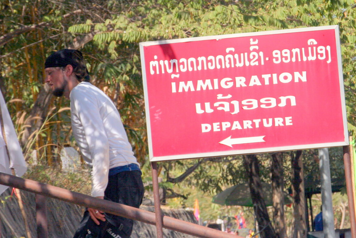 Wir kriechen am Boden unserer Villa entlang, tasten uns zentimeterweise voran – irgendwo müssen doch die beiden Minischrauben sein, die gerade von Franzis von Philip geöffnetem Tacho gepurzelt sind, als sie ihn einpacken wollte. Die Hektik des Morgens lässt uns schneller kriechen. Molle sitzt schon fertig gepackt vor dem Hotel auf dem Fahrrad, den Fuß zum Tritt bereit, die Villa ist ausgecheckt, ordnungsgemäß wurden uns noch 25 Cent für das Zerbrechen einer Wasserglasflasche abgezogen (40 Euro für die nächste Nacht, die das Zimmer freisteht sind ja auch wirklich wenig!), das „famous breakfast“ (wir sagen mal, der Durchschnitt an Ei, Toast, Nudelsuppe, Cornflakes und zweierlei Früchten sowie Nescafé) wird schon von der Magensäure beackert. Und da sind sie! Beide Schräublein werden zur Sicherheit eingetütet, die Morgengymnastik ist damit beendet und endlich kann es losgehen, zur wenige Kilometer entfernten Freundschaftsbrücke, die Thailand mit Laos verbindet. Bei 28 Kilometern Radellänge ist im Grunde keine Hektik angesagt, doch wir müssen unbedingt vor 11.30 Uhr in der Chinesischen Botschaft sein, Franzi und Philip vor 12.00 Uhr in der Thailändischen. Da wir nicht wissen, wie lange der Grenzübertritt dauert, ist nun Eile angesagt. Die thailändischen Grenzer setzen ihren Stempel routiniert und innerhalb einer Minute – sehr lobenswert. Auch die Formalitäten für das Visa on Arrival in Laos sind innerhalb einer knappen halben Stunde erledigt und wir treten rechtsseitig in die Pedale, und erreichen rechtzeitig unsere Botschaften in Laos Hauptstadt, die sich als beschaulich und gemütlich entpuppt.
