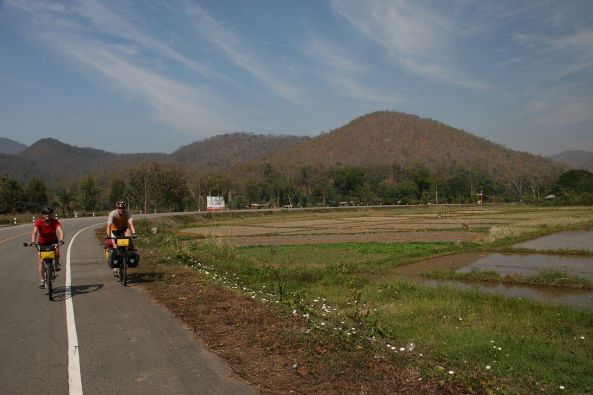 Warum sollten wir auch vor 11 Uhr wegkommen. Wäre ja mal gar nicht typisch für uns. Aber wir befinden uns ja in der kühlen Trockenzeit und da wird es selbst mittags nicht unerträglich heiß – also alles im grünen Bereich. Wir setzen uns auf die Straße 108 nach Süden. Diese ist hervorragend ausgebaut und auch wenig befahren, aus Sicht des Radfahrers also bestens geeignet. Einige große Steigungen stehen heute auf dem Programm, sollen aber deutlich flacher sein als gestern. Dafür ist die Gesamttendenz steigend. Und so kommt es dann auch, dass die Kilometersteine am Straßenrand von Km 67 eher zäh Richtung null zählen. Landschaftlich ist heute kein großes Kino, sodass sich der Kopf tendenziell mit dem Erspähen des nächsten Kilometersteins beschäftigt. Dementsprechend langwierig gestalten sich dann auch die Streckenabschnitte. Ein paar Esspausen lockern den heutigen Ausritt auf. Wir durchfahren nur wenige Dörfer, sehen auch nur wenige Menschen. Abgesehen von einigen schönen Blicken auf selbst jetzt saftige Reisfelder mit Hüttchen und in die burmesische Bergwelt insgesamt, wie schon erwähnt, eher eine Etappe aus der Kategorie „Vorankommen“.