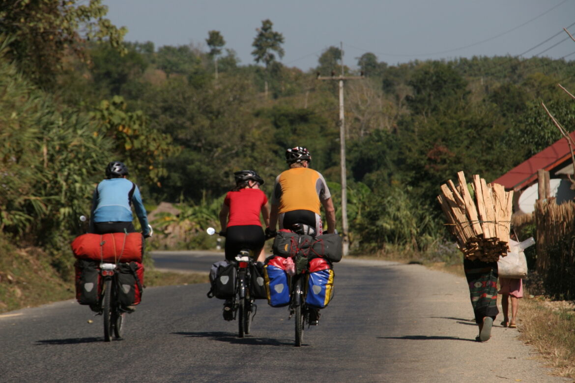 Um an einem Tag das gut 140 km entfernte Nong Khiao zu erreichen, wollen wir uns ein gutes Stück aus Luang Prabang hinausfahren lassen. Nach 40km hält unser Fahrer im vereinbarten Dorf an, doch um keinen Stress zu haben, legen wir noch ein paar Banknoten drauf, und werden noch 10 km weiter kutschiert. Es ist sowieso total neblig und kühl, da genügt es, später aufs Rad zu steigen. Als wir im nächsten Dorf unsere Räder beladen, kommt die Sonne allmählich durch. Eine wunderschöne Etappe beginnt. Die kaum befahrene Straße schlängelt sich durch Dörfer, in denen die Menschen wieder wesentlich agiler wirken, als in den Hmong Dörfern, die wir in den Bergen vor Luang Prabang passiert hatten. Unter jedem dritten Haus steht mindestens ein Webstuhl, so manche Frau sitzt bereits wieder bei der Arbeit daran. Viele sind mit der Anfertigung von Algenblättern beschäftigt. Wir nehmen dies bei einer Familie genauer in Augenschein: die aus dem Fluss gefischten Algen werden auf Bambusmatten gestrichen und flachgeklopft; auf die nasse Masse wird Sesam (und in unserem Beispiel auch Tomaten- und Knoblauchscheiben) gestreut; die fertig belegten Matten werden dann auf Ständern zum Trocknen in die Sonne gelegt. Gegen Abend werden wir das Abnehmen der Algenblätter und das Eintüten beobachten können. Alle Dorfbewohner reagieren freundlich bis enthusiastisch auf die Gegenwart von vier Langnasen auf Fahrrädern. Die Kinder schreien und winken wieder wie wild, sie hüpfen und strahlen vor Freude, wenn ihre Hände unsere berühren und wenn wider Erwarten nach zwei „Falang“ nochmal zwei daherkommen. Durch diese Dörfer zu fahren ist uns viel angenehmer – auch wenn sie nicht unbedingt reicher wirken, als die zuletzt gesehenen, so bringen sie doch eine ganz andere Lebensfreude zum Ausdruck. Ab und an sieht man jemanden Gitarre spielen oder sich vor überdimensionalen Boxentürmen an der Gesangskunst versuchen. In dieser Gegend sieht man nicht viele Pfeifchen oder Wasserpfeifen, stattdessen scheint – besonders bei Damen im fortgeschrittenen Alter – das Betelkauen sehr populär. Wir haben zwar in Luang Prabang das Ethnic Center besucht und vieles über die ethnischen Minderheiten von Laos erfahren (Tracht, Lebensstil, Typisches), doch so richtig auseinanderhalten können wir sie dennoch nicht. Immer wieder fragen wir uns, ob die Dorftore aus Bambus, die kein Besucher berühren darf, nun für ein Akha-Dorf typisch sind, oder ob wir uns gerade in einem Dorf der Tai befinden? Es gilt, noch einiges nachzulesen. Interessant ist es aber auch so. In einer dunklen Hütte sehe ich eine Frau eine selbstgemachte Matratze zu füllen. Noch immer werden viele Dinge des alltäglichen Bedarfs wie Decken, Schlafmatten aus Bambus, Matratzen, Kleidungsstücke und Moskitonetze in Handarbeit angefertigt. Vor ein paar Tagen sahen wir vier jugendliche Hmong-Mädchen, in festlicher Tracht, mit Schmuck und Münzen behängt, ebenso vielen ungefähr gleichaltrigen Jungen gegenüberstehen. Sie warfen sich eine Art Tennisball zu. Bei diesem – auf den ersten Blick eher langweilig wirkenden Spiel – handelt es sich um ein Flirtritual. Die beiden Geschlechter sollen sich so näher kennenlernen. Wenn der Ball auf die Erde fällt, muss dem Gegenüber etwas überreicht werden. Die Mütter der Mädchen arbeiten oft monatelang an der Tracht für dieses Ritual. Da es verboten ist, jemanden aus dem eigenen Dorf zu heiraten, müssen die Jungs oft einen weiten Weg zum „Ballspielen“ auf sich nehmen.