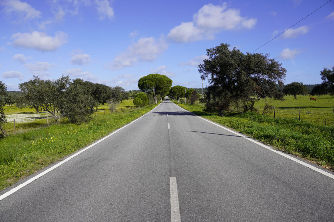 Um den Bahnsteig herum erblickten wir nichts außer Straßen und Felder. Es handelt sich bei der Station Casa Branca um einen reinen Umsteigebahnof. Für uns allerdings der perfekte Ort zum Start, liegt er doch direkt an der N2. Ehrfurchtsvoll hatten wir die Tage vorher auf der Karte die endlosen Geraden studiert. Wie würde der Verkehr sein? Wie langweilig könnte es werden, immer wieder 15 Kilometer bis zur nächsten Kurve nur geradeaus zu radeln? Bald schon wussten wir es.
