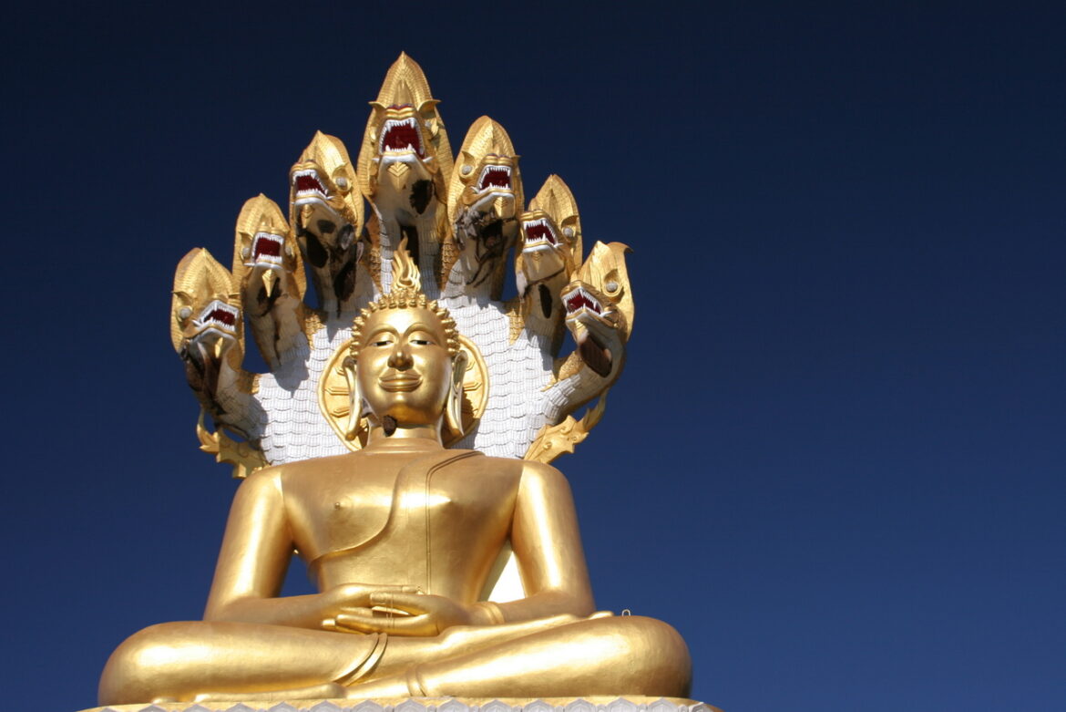 Man schraubt sich nach oben bis zum Allerheiligsten: einer Buddha-Reliquie hinter Glas. Eine, die wohl an einem der schöneren Plätze ihrem Alltag fristen darf: im neuen Chedi, der nicht nur nachts bunt beleuchtet ist, sondern selbst in zahlreichen Pastellfarben und mit bunten Mustern, die fast schon arabisch anmuten, bemalt ist. Man kann im Inneren des Chedi drei Stockwerke über eine Wendelrampe hinaufgehen und passiert dabei Meditationsräume und eine umfangreiche Sammlung buddhistischer Skulpturen. Auf jeder Ebene kann man nach außen treten und die wunderbare Aussicht auf das Thaton-Tal und – in entgegengesetzter Richtung – nach Burma genießen. Außerdem sieht man die zum Komplex gehörende, überdimensionale Naga-Schlange sowie auf anderen Hügeln mehrere Buddhastatuen. Der Himmel beglückt mit herbstlich anmutendem strahlendem Blau und das Gold der etwas weiter bergabwärts thronenden Göttin der Barmherzigkeit und das Weiß des noch weiter unten angesiedelten chinesischen Buddhas bieten einen imposanten Kontrast dazu.