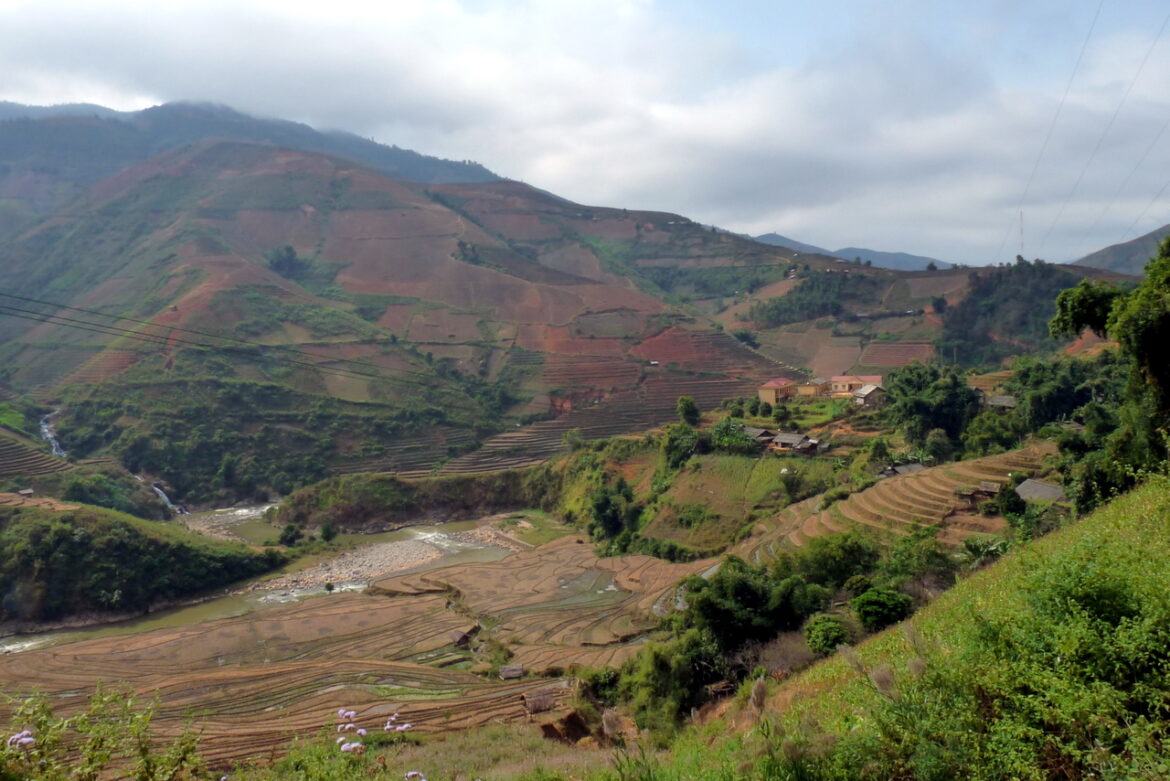 Gegen 15 Uhr erreichen wir den Weiler Mu Cang Chai auf knapp 1000m. Lang war die Strecke heute nicht, aber knackig – umso weniger sind wir es noch. Uns bleibt die Wahl zwischen Hotel in Blockbauweise und Guesthouse in Pfahlbauweise – doch auch nach laengerem Warten erscheint niemand, der fuer das Guesthouse zustaendig ist, und so checken wir im 2. Stock des Hotels ein und geniessen die letzten Sonnenstrahlen auf dem Balkon, bevor einige Wolken die Waerme stehlen. Als wir gerade so dasitzen und eine Vorabend-Nudelsuppe einnehmen, fahren zwei grosse, schwarze Koffer den Gang entlang zum Zimmer neben uns. Wir fragen uns, wer hier wohl eincheckt und begruessen sodann Anita und Erwin aus der Schweiz, die den Koffertraegern folgen. Wir kommen ins Gespraech und erfahren, dass die beiden mit einem Fahrer und einem Fuehrer seit gut 2 Wochen in Vietnams Norden unterwegs sind. Sie haben schon diverse Strassen abgefahren und sehr viel gesehen. Vorsichtig laden wir uns selbst ein, sie zum Essen zu begleiten – mit so einem ortskundigen Fuehrer hoffen wir auf ein Restaurant und die Chance, etwas anderes als Suppe zwischen die Zaehne zu bekommen. Zu viert sitzen wir kurz spaeter vor Fruehlingsrollen und gebratenen Nudeln – na, das ist ja mal ein kulinarischer Anfang. Die nette Unterhaltung setzen wir anschliessend noch bei einigen Fingerhueten vietnamesischen Gruentees in der Hotellobby fort.