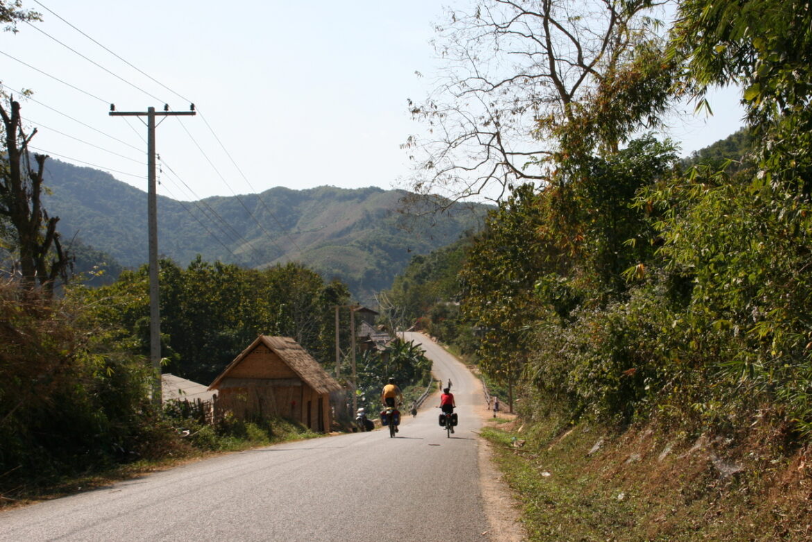 Insider Tipp: früh dran sein und die wenigen, weichen Autositze im Holzboot besetzen! Das muss man uns nicht zweimal sagen. Während wir noch unsere Sachen einpacken bestellen wir viermal „brädbaddertschäm and kaffeelao“. Schnell reingeschoben und ab zum Bootsanleger. Franzi besetzt die Polstersitze, wir verladen Gepäck und Fahrräder. Während wir Mädels uns danach im perfekt auf die Bootstouristen eingestellten Ort „sandwiches to go“ schmieren lassen füllen sich auch die „billigen Plätze“ der Dschunke, die Holzbänke, mit Fahrwilligen. Manch ein Franzose verlässt kurz vor Abfahrt noch das Schiff – sei es aus Klaustrophobie oder aus „ist-ö ridücülös“ – besonders lustig für die Zurückbleibenden die Variante: ich hau mir noch kurz zweimal das Hirn an und fühle mich bestätigt: „That’s whyö äim lieving de böut!“ Umso besser – zügig werden die frei gewordenen Holzbänkchen zu bequemen Sitzgruppen angeordnet. Gemächlich mit lautem Knattern und nachdem fast die ganze Belegschaft an einer Kohlenmonoxidvergiftung krepiert ist, tuckern wir los. Die gesamten 120 Kilometer auf dem braunen Wasser sind pittoresk, wenn auch nicht besonders abwechslungsreich. Wie auch. Die Ufer sind felsig und sandig, Dörfer kippen ab und zu aus dem dichten Busch herunter bis auf einen sicheren Abstand zum möglichen Höchststand des Wassers während der Regenzeit. Was unserem Eindruck nach mindestens fünf Meter ausmacht. Große Felsansammlungen, die aus der Mitte des Flusses herausragen, sind dann höchstwahrscheinlich verschwunden. Das Ufer wird in der Nähe der Dörfer auch landwirtschaftlich genutzt, doch die Flächen sind sehr steil und nur klein. Das Boot tut sich flussaufwärts sichtlich schwer. Die Strömung ist stark, beim Passieren von Stromschnellen hat man richtig das Gefühl, bergauf zu fahren. Im hinteren Teil des Bootes, nahe dem Motor, ist es extrem laut. Gut, dass wir so früh dran waren und vorne gleich die doppelten Luxusplätze (weich und ruhig) haben. Die knapp neun Stunden verbringen wir mit plaudern, lesen, beobachten und Sandwich oder Suppe vertilgen. Die Sonne beendet ihr Tageswerk und das Boot tut es ihr gleich, wir legen in Houay Xay an. Mit den Rädern sind wir schnell im Ort, checken in eine ordentliche Unterkunft ein und werden bei der Nahrungssuche erneut nicht enttäuscht. Teriaki Chicken, Chickencurry, verschiedene Gemüsegerichte und Kartoffelcurry stehen vor uns auf dem Tisch. Den mit bunten Streuseln verzierten Schoko-Bananen-Pfannkuchen verspeisen wir auf Matzes Wohl, den wir davor noch kurz anrufen, um ihm zum 35. Geburtstag zu gratulieren! Alles Gute, bleib wie du bist!