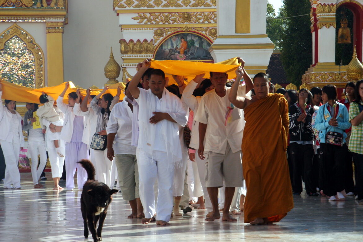 Die Suche nach einer Unterkunft führt uns am Mekong entlang. Der Wind bläst, wie heute schon den ganzen und überhaupt die letzten Tage, sehr stramm aus Nordosten. Wird halt doch der Monsun sein. Jedenfalls macht er einen auf Dauer recht mürbe. Und auch hier am Ufer hat man das Gefühl, man steht an der Nordsee. Ein Hotel weist uns ab, da es schon ausgebucht sei. Denkbar, ist doch heute Freitag und die Thai-Wochenendparty-Reisenden sind im Anmarsch. Man ist aber so freundlich uns eine alternative Unterkunft zu vermitteln. Ein paar Häuser weiter, zum Hotel gehörend. Wir bekommen sogar morgen Frühstück serviert. Letztlich entpuppt sich unser Zimmer als Ferienwohnung mit Aufenthaltsraum, Schlafzimmer, Bad und Küche. Das wäre aber doch nicht nötig gewesen, wir gehen trotzdem lieber essen. Für acht Euro wird uns der Schlüssel überlassen. Da wollen wir mal nicht meckern. Die Sonne wärmt unsere Häupter angenehm, als wir auf unserer Terrasse das gemütliche Treiben der Menschen im Ort beobachten. Vor dem Sonnenuntergang besichtigen wir noch den Wat Phra That Phanom. In der Abendsonne leuchtet die golden verzierte 57 m hohe Stupa, die nach dem Einsturz des Originals 1976-1978 neu errichtet wurde. In dem Turm befindet sich angeblich ein Brustbeinsplitter des Buddha. Wegen dieser Reliquie ist der Tempel ein hochverehrter Wallfahrtsort für Laoten und Thailänder. Die Gläubigen umkreisen andächtig die Stupa im Gegenuhrzeigersinn. In ihren gefalteten Händen halten sie Blumen bereit, die sie im Anschluss unter laut gemurmelten Gebeten an der heiligen Stätte niederlegen. Manche Pilger sind ganz in Weiß gekleidet und tragen – angeführt von einem Mönch, der die Gebete leitet – ein orangefarbenes langes Tuch über ihrer Gruppe. Gebannt beobachten wir die stimmungsvollen Prozessionen.