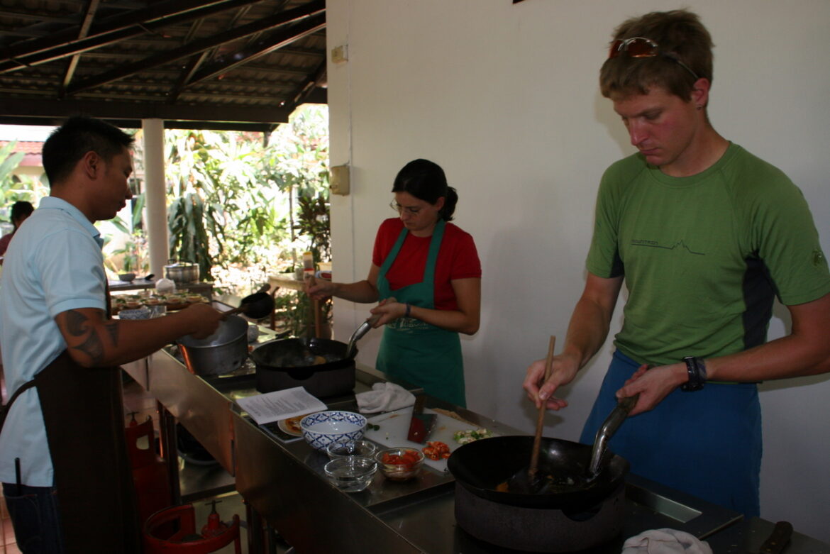 Schon geht es los mit dem ersten Rezept und das Häuflein der Thai-Köche bzw. Bald-Thai-Köche verschwindet im klimatisierten Show-Room. Unser Lehrer für heute ist ein junger Thai mit tätowierten Armen – er ist sicher ein guter Koch, aber kein guter Entertainer. So laufen die Demonstrationen fachlich richtig und informativ, aber nicht sonderlich unterhaltsam ab. Aber man trifft sich hier ja schließlich um kochen zu lernen und nicht um sich unterhalten zu lassen. Dafür kann man ja schließlich ins Kino gehen…Kurz werden also die verwendeten Zutaten erläutert, ehe O (so der Name des Lehrers) unter einem großen, gekippten Spiegel (dass man schön von oben in die Töpfe und Woks blicken kann) Schritt für Schritt das jeweilige Gericht vorkocht. Sodann strömen die Kochlehrlinge hinaus an die Kochstellen, Profigasbrenner, wo schon alle Zutaten fein säuberlich vorbereitet sind. Ein wenig muss noch geschnippelt werden, dann brät, rührt und kocht jeder sein eigenes „Süppchen“ zusammen. Gleich im Anschluss wird dieses genüsslich verspeist. Auf zum nächsten Gericht…so läuft das weiter, bis alles sechst Gerichte zubereitet und verdrückt sind. Die Uhr zeigt 16 Uhr, als uns die Busse der Kochschule wieder wohlbehalten in der Altstadt absetzen. Wir haben den Tag in der Küche wahrlich genossen, gelernt und geschlemmt.